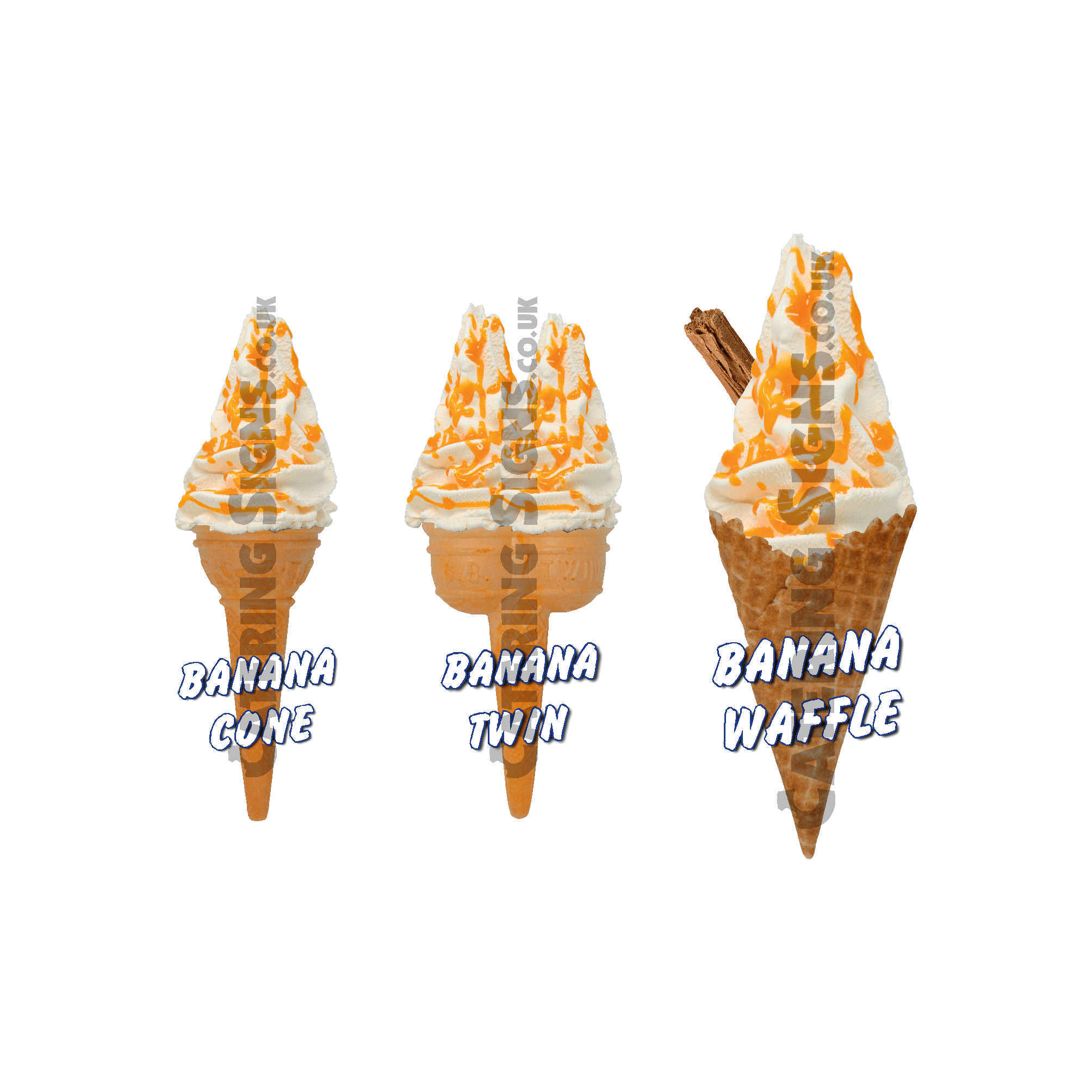 Self adhesive vinyl stickers with a single cone, twin cone and waffle cone in each set. Single and twin cones are each approximately 16.5cm high without a Flake and the waffle cones are approximately 20cm high with a Flake.